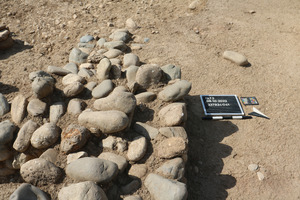 This wall is abutting to the east with wall Locus:237934:031 and to west with the corner wall support Locus:237934:058. It is binding with wall Locus:237934:040 to the north and with wall Locus:237934:042 to the west. It consists of two rows of stones, three layer of stones and on top the stones are set orthogonal to the orientation of the wall. These stones are about 20 - 30cm long and 15 - 20cm wide. In between the stones are sometimes some rubbles. The wall is orientated from SE to NW and has an length of 1,4m, width of 0,5m, and a height of 0,5m. its lowest layer of stones is lying on the floor level of Locus:237934:025 and floor Locus:237934:066. |
